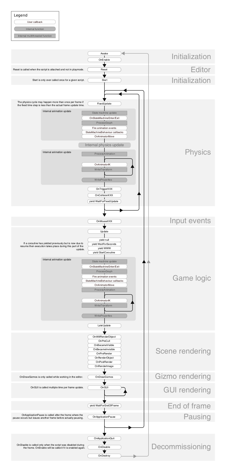 이 생명주기에 따라서 게임 오브젝트가 생성되고 파괴되는 과정에서 어떤 메서드가 언제 호출되는지 알 수 있으며, 적절한 시점에 로직을 추가할 수 있다.